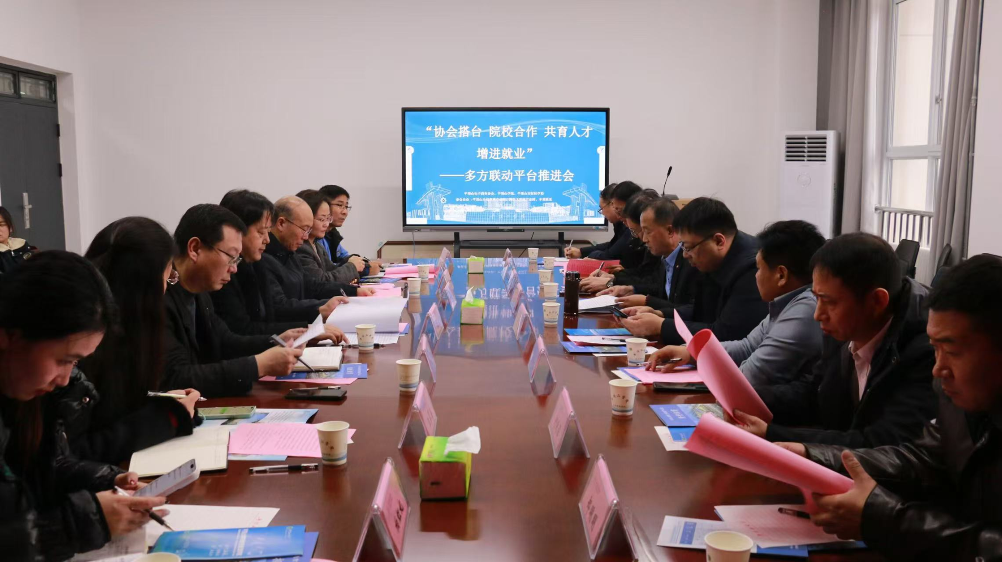 12 月 22 日下午,“协会搭台 院校合作 共育人才 增进就业” 多方联动平台推进会在知行楼 rb422 会议室召开。平顶山市财经学校党委书记周勃、平顶山市电子商务协会秘书长 姬国平、我校副校长李波及相关部门、学院负责人,企业代表及部分师生代表齐聚,共探“政会校企”协同育人新路径。会议由平顶山市电子商务协会秘书长姬国平主持。