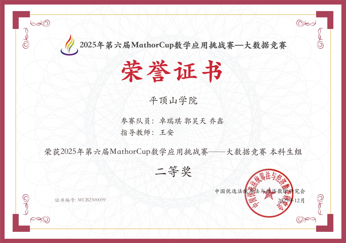 近日,2025年全国大学生数学建模竞赛与第六届mathorcup数学应用挑战赛-大数据竞赛结果相继揭晓。我院大数据管理与应用专业卓瑞琪团队和王凯团队凭借扎实的专业功底、出色的团队协作与创新的解题思路,在两大高规格赛事中脱颖而出,分别斩获国家一等奖、国家二等奖与国家三等奖,为学校赢得了荣誉。